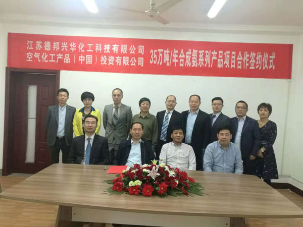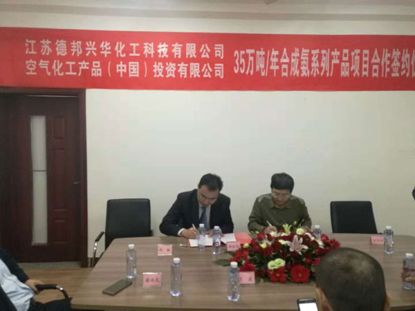2018年10月11日下午,江苏德邦兴华化工科技有限公司与美国空气化工产品(中国)投资有限公司关于搬迁改造项目合作签约仪式在阳森公司会议室隆重举行。江苏德邦化工集团董事长赵祥海、总裁助理高美霞,江苏德邦兴华化工科技有限公司总经理孙成亮、副总经理潘杭军等领导;美国空气化工产品(中国)投资有限公司顾效冬总监、谌业文总监、王磊经理、尹烈经理、曾凡林经理、闵淑玲经理等领导;徐圩新区管委会江行洲书记、重大办郑彬主任、投资促进局陶亚局长等领导出席签约仪式。