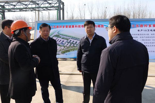 3月8日上午,市委常委、市长方伟携市委秘书长韩尚富、市发改委、市工信局、市自然资源和规划局、市生态环境局主要负责人及东海县领导相关领导一行莅临江苏德邦多菱健康科技有限公司厂区,督查市级重点项目推进工作,并与集团公司董事长赵祥海进行亲切交谈。在听取集团公司董事长关于产业布局、项目建设和经营效益等相关情况汇报后,方伟勉励企业要坚定发展信心、树立高远志向,大力推进创业创新,顽强拼搏,不懈努力,推动企业做大做强,力争项目早日建成投产,为地方经济发展再做新贡献。他强调,东海县相关部门要进一步加大帮扶企业力度,抓紧落实企业相关手续的办理,推动有关项目早日建成投入运行。同时他也表示,将抓紧推动德邦老厂区地块的挂牌出让工作,为德邦的整体搬迁项目建设提供支持。