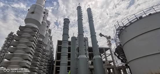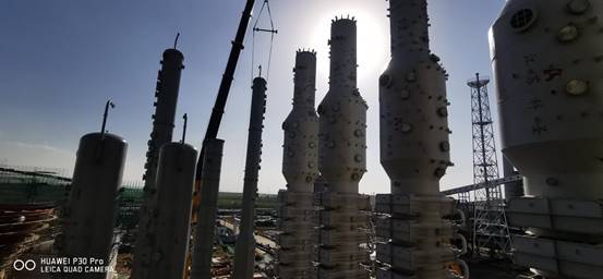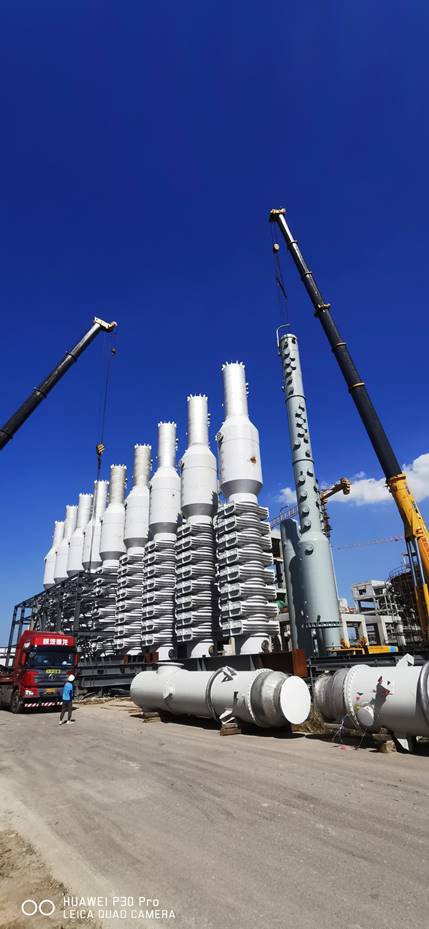七月的骄阳似火,兴华科技公司联碱现场的设备安装也正在经受这盛夏的考验,炎热的天气,挡不住兴华科技员工的工作热情,经过前期的精心准备,由三门峡化机制造的联碱大型塔器碳化尾气净氨塔、滤过尾气洗涤塔、滤过尾气净氨塔、和淡液蒸馏塔以及煅烧炉气洗涤塔等塔陆续进厂,经过相关部门领导的统筹协调,分两次将7台大型塔器全部安全吊装到位,至此联碱重碱现场的所有塔器全部安装完成,为下一步的管道安装打下了坚实的基础。